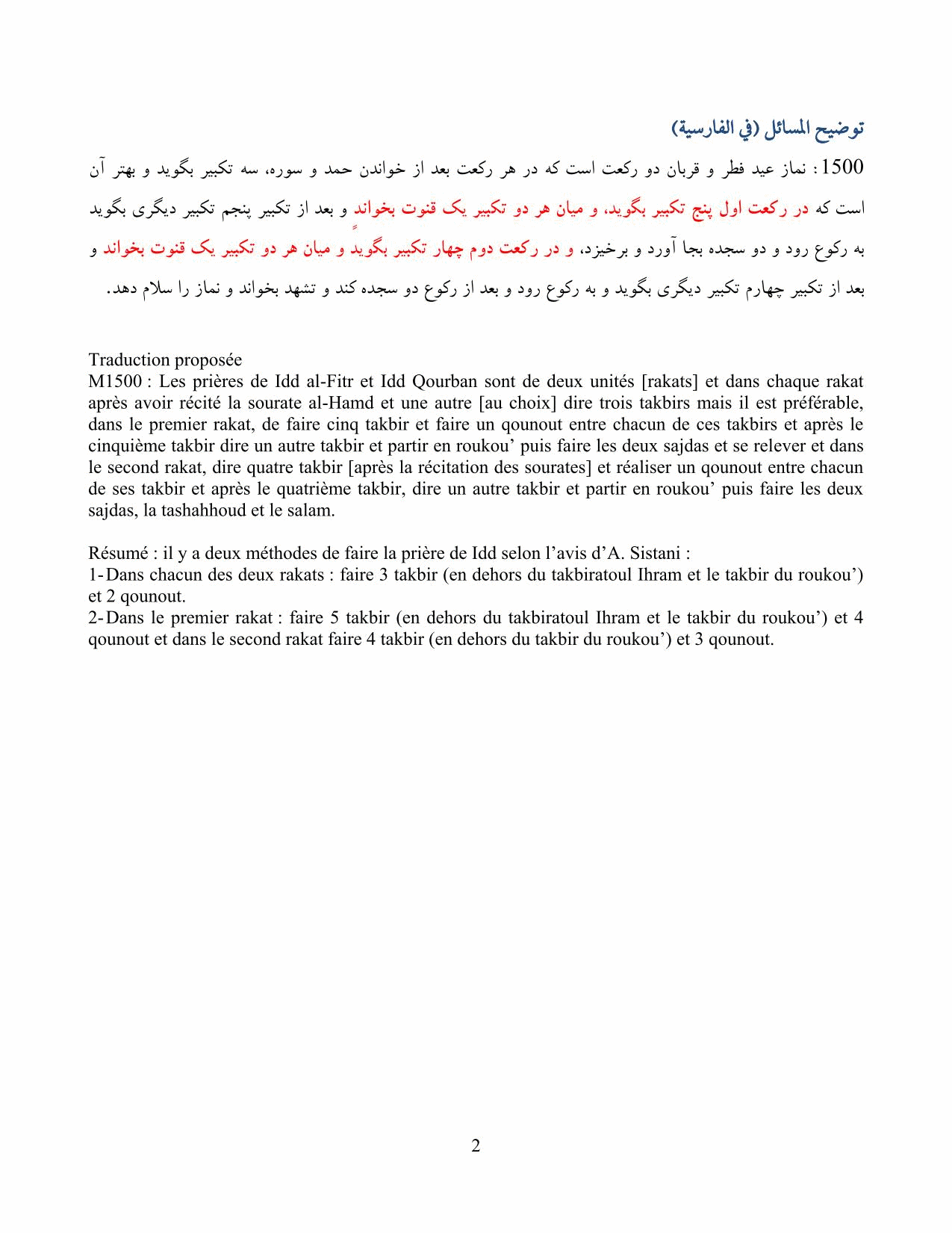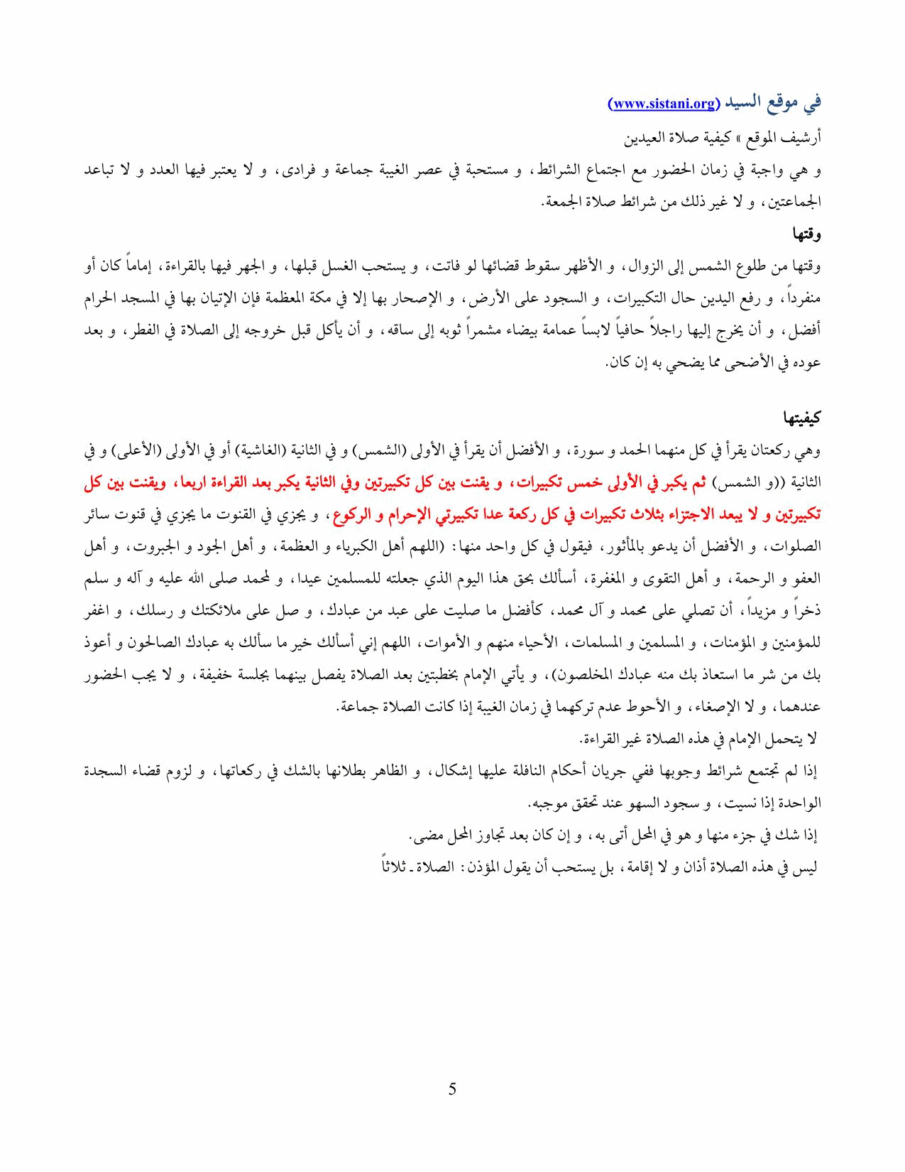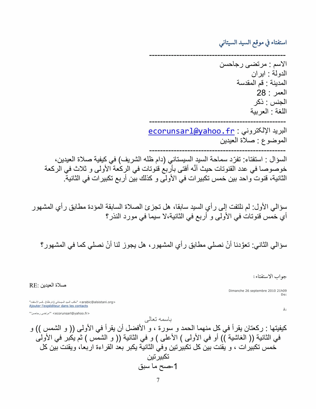 Texte en arabe et explicationsde Mourtouza RADJAHOUSSENsur la précision apportée par Ayatoullah al Ouzama Sayyed Ali Al Housseini As Sistani concernant le Namaz-e-Eid