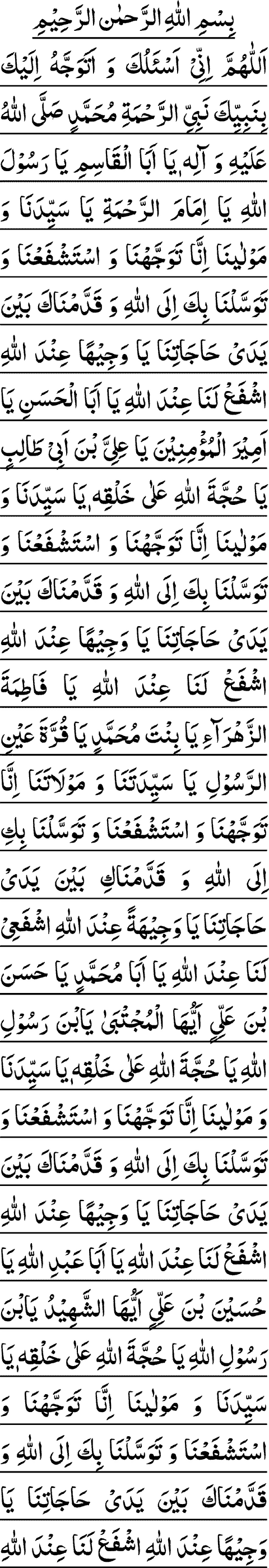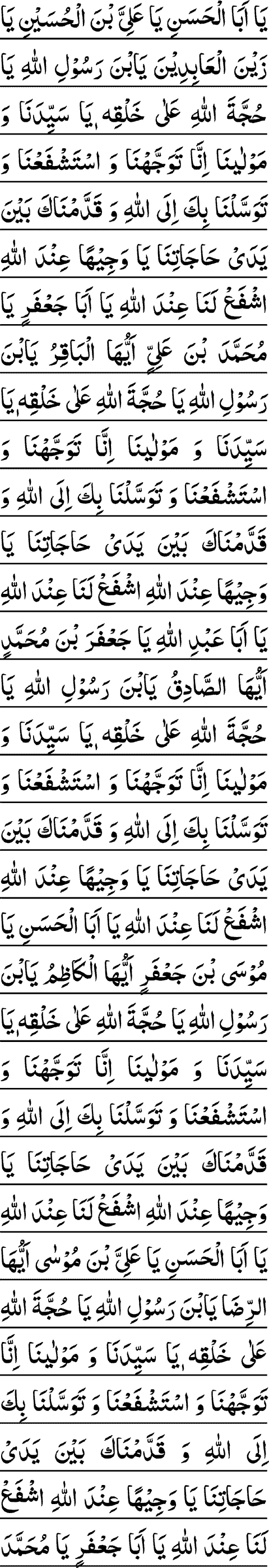 YAA SAADATI WA MAWAALIYYA INNEE TAWAJJAHTO BEKUM A-IMMATI WA U'DDATI LE YAWME FAQRI WA HAAJATI ELAL-LAAHE WA TAWASSALTO BEKUM ELLALLAAHE, WAS TASH FA'TO BEKUM ELALLAAHE FASH-FA-OO'LEE I'NDALLAAHE VASTANQEZOONI MIN ZONOOBI I'NDALLAAHE FA INNAKUM WASILATI ELALLAAHE WA BEHUBBEKUM WA BE QURBEKUM ARJOO NAJAATAN MENALLAAHE FAKOOMOO I'NDALLAAHE RAJAAA-E'E YAA SAADATI YAA AWLEYAAA-ALLAAHE SALLALLAAHO A'LAYHIM AJMA-E'EN WA LA'-NALLAAHO A'DAA-ALLAAHE ZAALEMEEHIM MENAL AWWALEENA WAL AAKHEREENA AAMEEN RABBAL A'ALAMEEN.