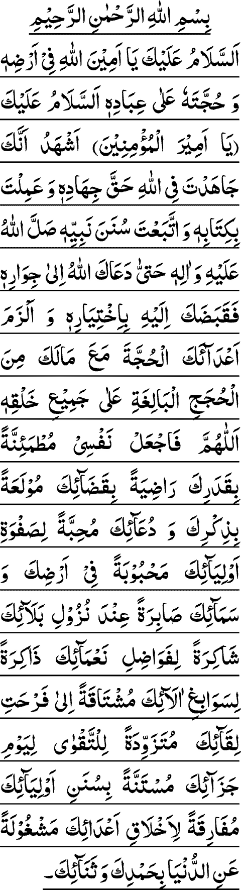 ASSALÂMU ‘ALAYKA YÂ AMÎN-ALLÂH FÎ ARDHIHI WA HUJJATIHI ‘ALÂ ‘IBÂDIHI. ASSALÂMU ‘ALAYKA YÂ AMÎR-AL-MU’MINÎNA