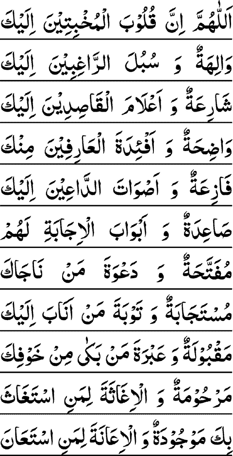 ALLÂHUMMA INNA QULÛB-AL-MUKHBITÎNA ILAYKA WÂLIHATUN, WA SUBUL-AR-RÂGHIBÎNA ILYAKA CHÂRI‘ATUN, WA A‘LÂM-UL-QÂÇIDÎNA ILAYKA WÂDHIHATUN, WA AF’IDAT-AL-‘ÂRIFÎNA MINKA FÂRIGHATUN, WA AÇWÂT-AD-D‘ÎNA ILYKA Ç‘IDATUN, WA ABWÂB-AL-IJÂBATI LAHUM MUFATTAHATUN,