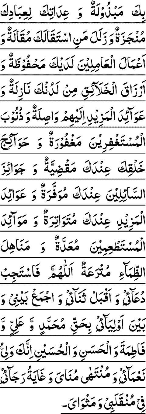 O Mon Dieu! Exauce donc ma prière de demande, agrée mes louanges, réunis-moi à mes amis, (je te conjure de le faire) par (l’amour de) Muhammad, Ali, Fâtimah, Al-Hassan et al-Hussayn. Tu es en effet le Maître de tous les bienfaits dont je jouis, le sommet de mes voeux, la destination finale de mon espoir dans mes mouvements et mon immobilité, lors de mon retour et de mon séjour.