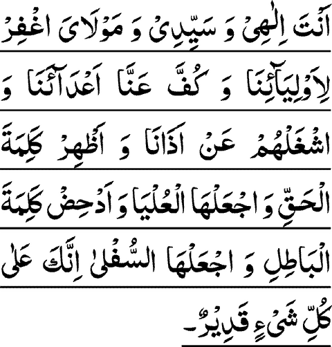 ANTA ILÂHÎ WA SAYYIDÎ WA MAWLÂYA. AGHFIR LI-AWLIYÂ’INA WA KUFFA ‘ANNÂ A‘DÂ’ANÂ, WA-CH-GHILHUM ‘AN ATHÂNÂ WA ADH-HIR KALIMAT-AL-HAQQI WA-J‘ALHÂ AL-‘ULYÂ WA-D-HIDH KALIMAT-AL-BÂTILI WAJ‘ALHÂ-S-SUFLÂ INNAKA ‘ALÂ KULLI CHAY’IN QADÎR-UN.