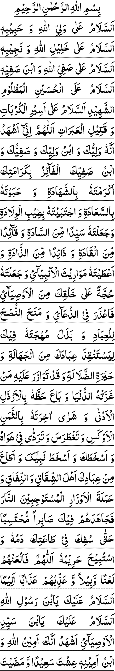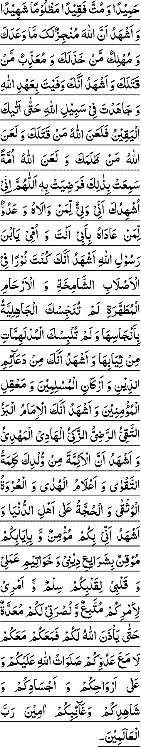 ASSALAAMO A’LAYKA YABNA RASOOLILLAAHE ASSALAAMO A’LAYKA YABNA SAYYEDIL AWSEYAAA-E ASH-HADO ANNAKA AMEENULLAAHE WABNO AMEENEHI I’SHTA SA-E’EDAN WA MAZAYTA HAMEEDAN WA MUTTA FAQEEDAN MAZLOOMAN SHAHEEDAN.
