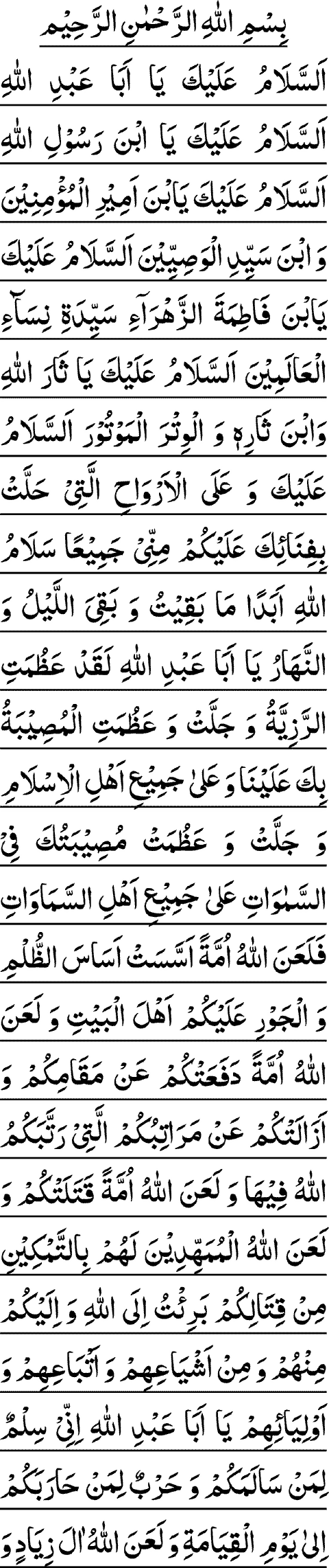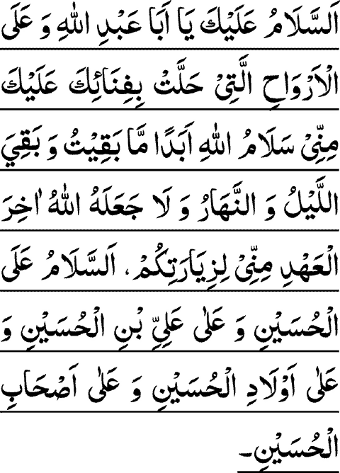 ASSALAAMO A'LAYKA YAA ABAA A'BDILLAAH WA A'LAL ARWAAHILLATEE HALLAT BEFENAA-EKA A'LAYKA MINNE SALAAMULLAAHE ABADAN MAA BAQEETO WA BAQEYAL LAYLO WAN NAHAARO WA LAA JA-A'LAHULLAAHO AAKHERAL A'HDE MINNEE LE-ZEYAARATEKUM ASSALAAMO A'LAL HUSAYNE WA A'LAA A'LIYYIBNIL HUSAYNE WA A'LAA AWLAADIL HUSAYNE WA A'LAA ASHAABIL HUSAYNE