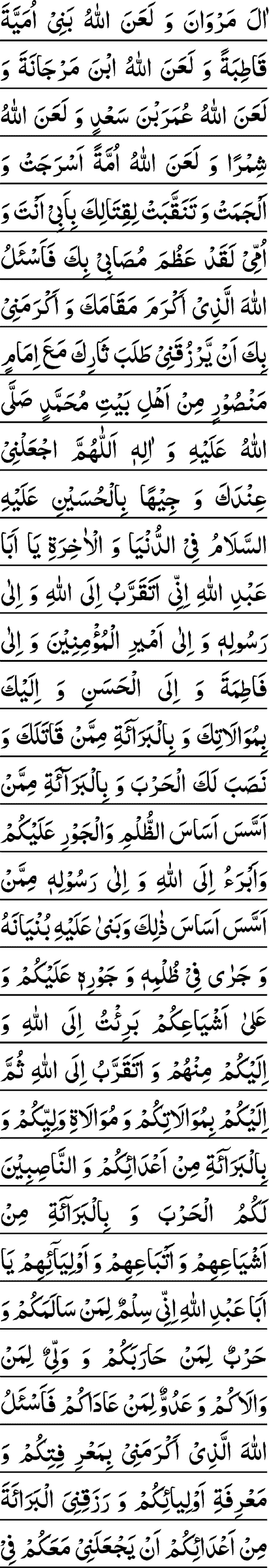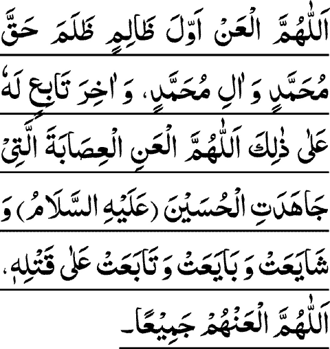 ALLAAHUMMAL-A'N AWWALA ZAALEMIN ZALAMA HAQQA MUHAMMADIN WA AALE MUHAMMADIN WA AAKHERA TAABE-I'N LAHU A'LAA ZAALEKA ALLAAHUMMAL-A'NIL E'SAABATAL LATEE JAAHADATIL HUSAYNA WA SHAAY-A'T WA BAAY-A'T WA TAABA-A'T A'LAA QATLEHEE ALLAHUMMAL-A'NHUM JAMEE-A'N