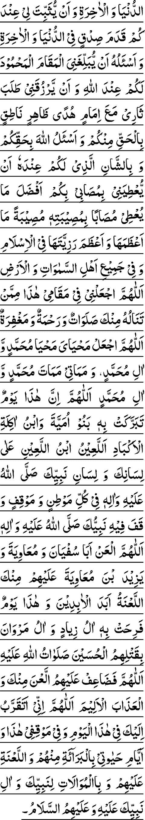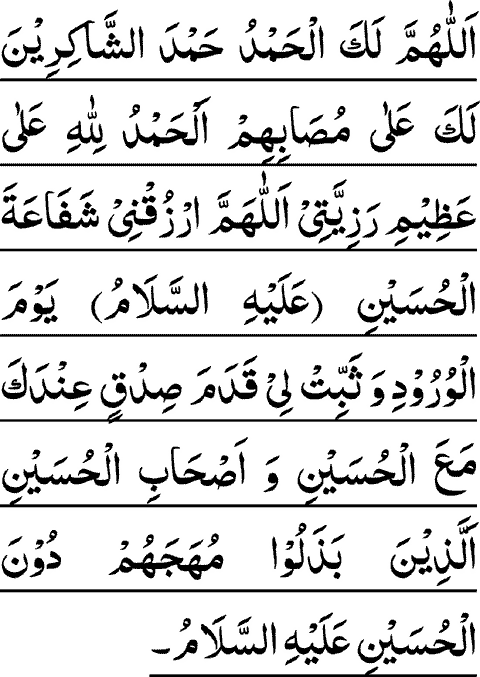 ALLAAHUMMA LAKAL HAMDO HAMDASH SHAAKEREENA LAKA A'LAA MOSAABEHIM ALHAMDO LILLAAHE A'LAA A'ZEEME RAZIYYATEE ALLAAHUMMAR-ZUQNEE SHAFAA-A'TAL HUSAYNE YAWMAL WOROODE WA SABBIT LEE QADAMA SIDQIN 'INDAKA MA-A'L HUSAYNE WA ASHAABIL HUSAYNIL LAZEENA BAZALOO MOHAJAHUM DOONAL HUSAYNE A'LAYHIS SALAAMO