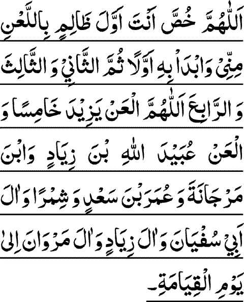 ALLAAHUMMA KHUSSA ANTA AWWALA ZAALEMIN BIL-LAA'-NE MINNEE WABDAA BEHEE AWWALAN SUMMAS SAANEYA WAS SAALESA WAR RAABE-A' ALLAAHUMMAL-A'N YAZEEDA KHAAMESAN WAL-A'N O'BAYDALLAAHIBNA ZEYAADIN WABNA MARJAANAH WA O'MARABNA SAA'DIN WA SHIMRAN WA AALA ABEE SUFYAANA WA AALA ZEYAADIN WA AALA MARWAANA ELAA YAWMIL QEYAAMATE