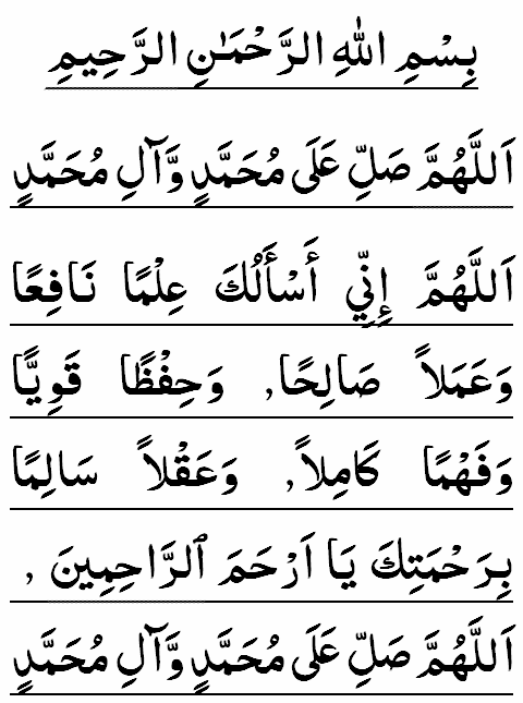 ALLAHUMMA SWALLI ‘ALA MUHAMMADIN WA AALI MUHAMMAD, ALLAHUMMA INNI ASALUKA ‘ILMAN NAFI‘A, WA ‘AMALAN SWALIHA, WA HIFZAN QAWIYYA, WA FAHMAN KAMILA, WA AQLAN SALIMA, BIRAHMATIKA YA ARHAMAR RAHIMEEN, ALLAHUMMA SWALLI ‘ALA MUHAMMADIN WA AALI MUHAMMAD.