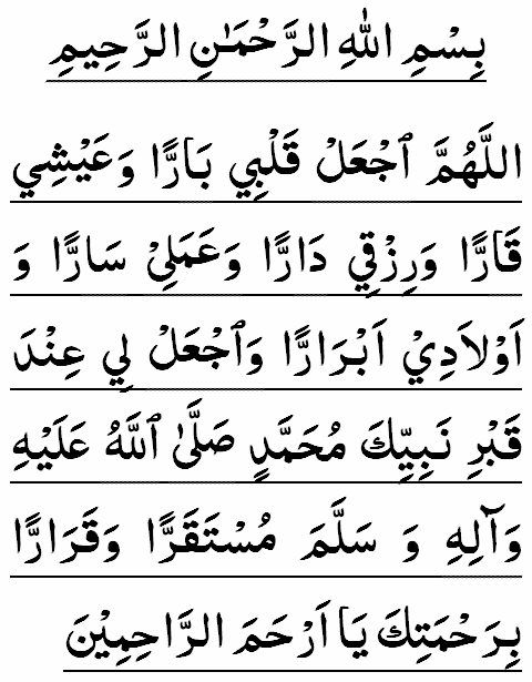 ALLAHOUMADJ AL QALBI BARRANE, WA AYSHI KARRANE, WA RIZKI DARRANE, WA AMALI SARRANE, WA AWLADI ABRARRANE, WADJ’ALLI INDA KABRI NABIYIKA MOHAMMADINE SALLALLAHOU ‘ALAYHI WA ALIHI WASSALLAME MOUSTAKARRANE WA KARARANE BI RAHMATIKA YA ARHAMAR RAHIMINE.