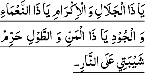 YA MANE YOU'TI MANE SSA-ALAHOU, YA MANE YOU'TI MA(NE)LAME YASS-ALOUHOU WA MA(NE)LAME YA'RIF-HOU TAHANNOU-NAME MINEHOU WA RAHMATANE, A'TINI BIMASS-ALATI IYYAKA DJAMY-A' KHAYRIDDOUNYA WA DJAMY-A' KHAYRIL AKHIRATI WASSRIF A'NNI BIMASS-ALATI IYYAKA DJAMI-A' SHARRI-DDOUNYA WA SHARRIL-AKHIRATI