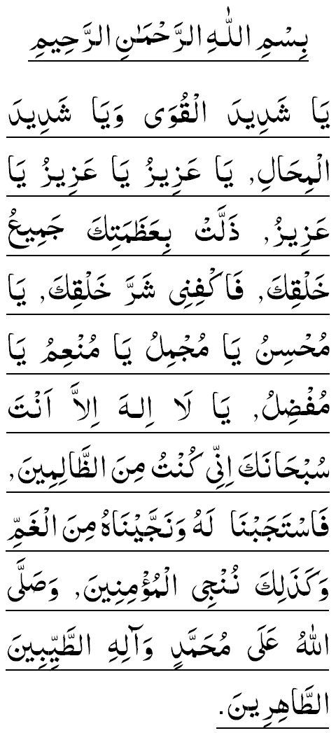 Aussi quiconque veut se protéger des événements néfastes propres à ce mois, qu'il lise dix fois l'invocation suivante chaque jour de ce mois :