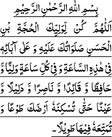 Ô mon Dieu ! Sois pour Ton Représentant, Ta Preuve, le fils d’al Hassan, que Tes prières soient sur lui et sur ses pères, à cette heure-ci et à toute heure un Wali, un Protecteur, un Chef, un Secours, un Guide, un Œil, jusqu’à le faire résider sur Ta terre de bon gré et le laisser y jouir de la vie, longuement, par Ta Miséricorde, ô Le plus Miséricordieux des miséricordieux !