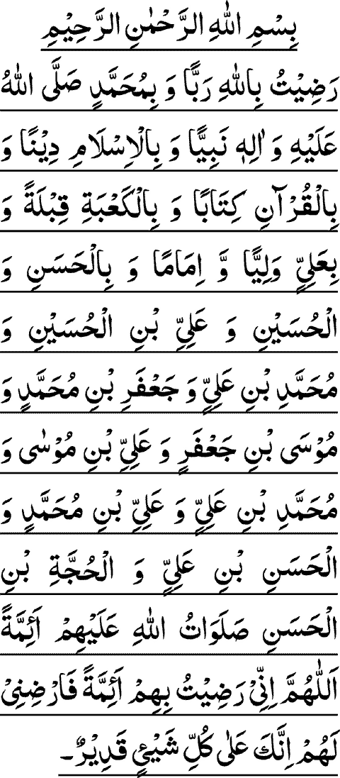 RAZEETO BILLAAHE RABBAN WA BE MOHAMMADIN SALLALLAAHO A'LAYHE WA AALEHI NABIYYAN WA BIL ISLAAME DEENAN WA BIL QUR-AANE KETAABAN WA BIL KA'BATE QIBLATAN WA BE A'LIYYIN WALIYYAWN WA EMAAMAN WA BIL HASANE WAL HUSAYNE WA A'LIYYIBNIL HUSAYNE WA MOHAMMADIBNE A'LIYYIN WA JA'FARIBNE MOHAMMADIN WA MOOSABNE JA'FARIN WA A'LIYYIBNE MOOSAA WA MOHAMMADIBNE A'LIYYIN WA A'LIYYIBNE MOHAMMADIN WAL HASANIBNE A'LIYYIN WAL HUJJATIBNIL HASANE SALAWAATULLAAHE A'LAYHIM A-IMMATAN ALLAAHUMMA INNEE RAZEETO BEHIM A-IMMATAN FARZENEE LAHUM INNAKA A'LAA KULLE SHAY-IN QADEERUN..