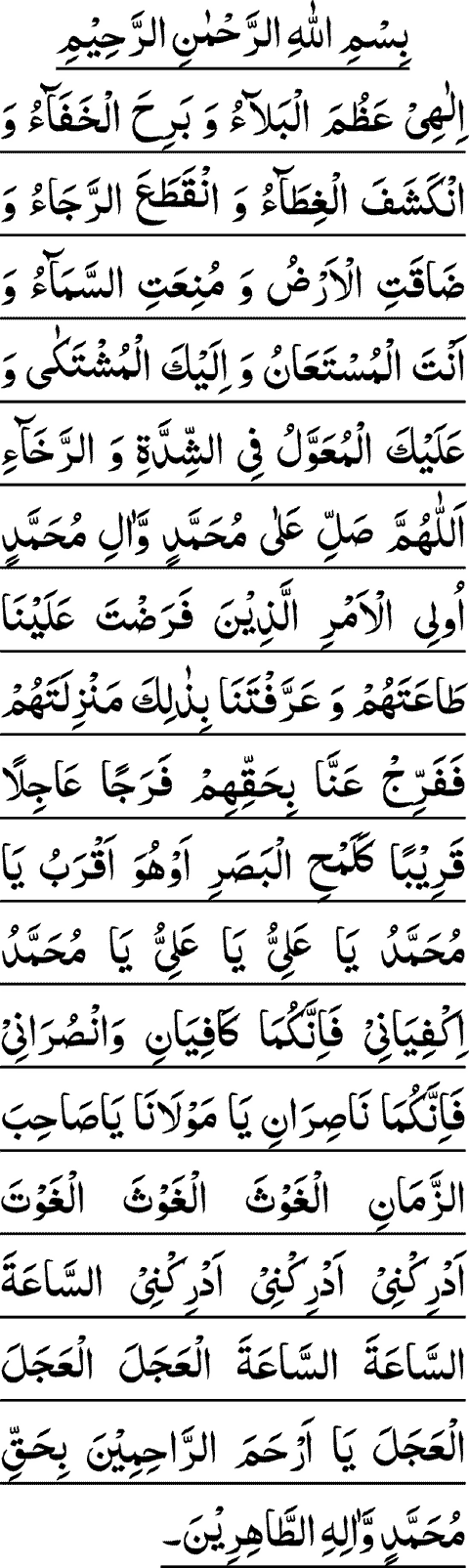 Ô Allàh, envoies Tes bénédictions sur Mohammad (SAW) et sa sainte famille qui sont Tes respectables Elus, et dont le chemin à suivre nous a été rendu obligatoire par Toi, et dont Tu nous a fait connaitre la Dignité. Ô Allàh, par leur grâce, délivres-nous des difficultés, avec une délivrance sereine et très rapide. Ô Mohammad, Ô Ali ; Ô Ali, Ô Mohammad!