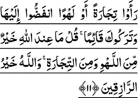 11. WA-ITHA RAAW TIJARATAN AW LAHWAN INFADDOO ILAYHA WATARAKOOKA