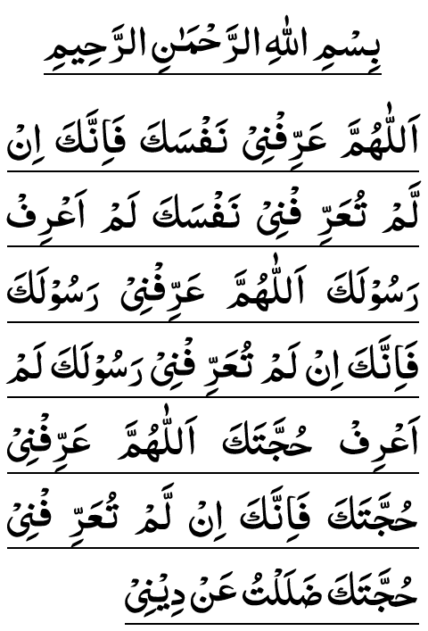 ALLAHUMMA 'ARRIFNI HUJJATAKA FA-INNAKA IN LAM TU'ARRIFNI HUJJATAKA DHALALTU 'AN DINI.