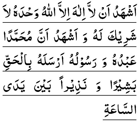 ACH-HADU ANLA ILAHA ILLALLAHU, WAHDAHU LA CHARIKA LAH; WA ACH-HADU ANNA MOHAMMADAN 'ABDUHU WA RASULOH, ARSALAHU BIL-HAQQI BACHIRAN WA NATHIRAN BAYNA YADAY-YIS-SA'AH.