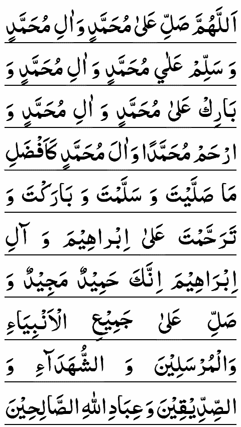 ALLAHUMMA ÇALLI 'ALA MOHAMMADIN WA ÂLE MOHAMMAD WA BARIK 'ALA MOHAMMADIN WA ÂLE MOHAMMAD WARHAM MOHAMMADAN WA ÂLE MOHAMMAD KA-AFDHALI MA ÇALAYYTA WA BARAKTA WA TARAH-HAMTA 'ALA IBRAHIMA WA ÂLE IBRAHIMA, INNAKA HAMIDUM MAJID. WA ÇALLI 'ALA JAMI'-IL ANBIYA'I WAL-MURSALINA WACH-CHUHADA'I WAÇ-ÇADIQINA WA JAMI'I 'IBAD-ILLAH-IÇ-ÇALIHIN.
