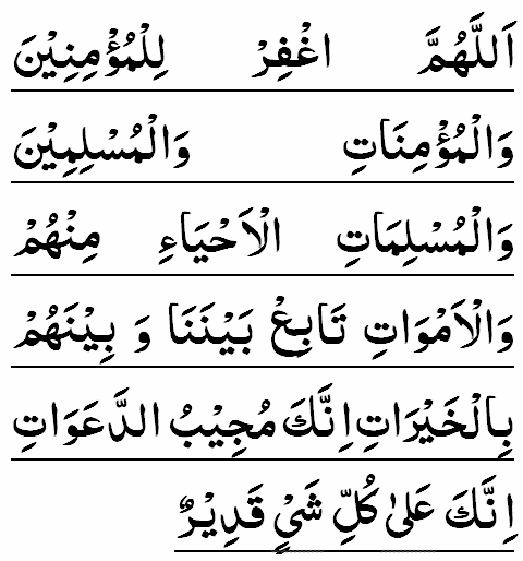 ALLAH-UMM-AGHFIR LIL-MUMINA WAL-MU'MINATI, WAL-MUSLIMINA WAL-MUSLIMAT, AL-AHYA'I MINHUM WAL-AMWAT, TABI' BAYNANA WA BAYNAHUM BIL-KHAYRATI INNAKA MUJIB-UD-DA'AWAT, INNAKA 'ALA KULLI CHAY'IN QADIR.