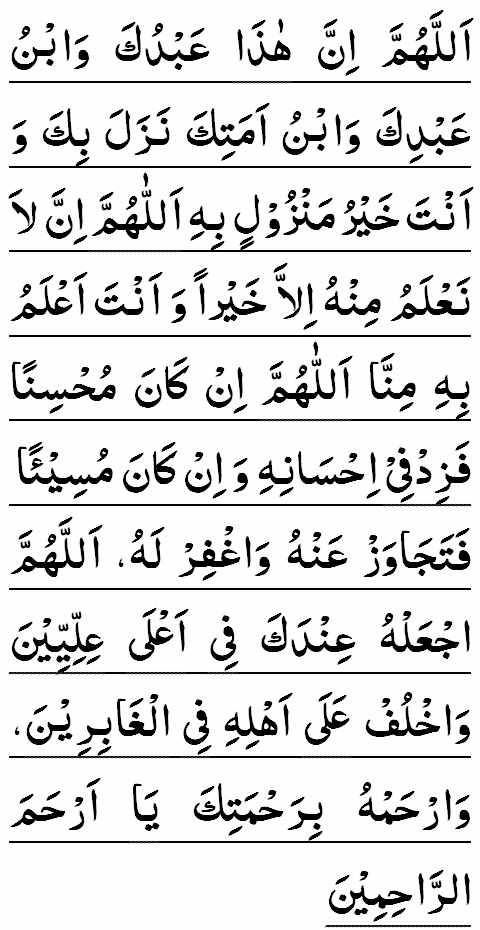 ALLAH-UMMA INNA HATHA 'ABDUKA WABNU 'ABDIKA WABNU AMATIKA NAZALA BIKA WA ANTA KHAYRU MANZULIN BIHI. ALLAH-UMMA INNA LA NA'LAMU MINHU ILLA KHAYRA WA ANTA A'LAMU BIHI MINNA. ALLAH-UMMA IN KANA MOHSINAN FA-ZID FI IHSANIHI WA IN KANA MUSIAN FATAJAWAZ 'ANHU WAGHFIR LAHU. ALLAH-UMMA-J'ALHU 'INDAKA FI A'LA 'ILLIYIN WAKHLUF 'ALA AHLIHI FIL-GHABIRIN WARHAMHU BI-RAHMATIKA YA ARHAM-AR-RAHIMIN.
