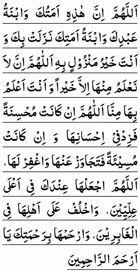 ALLA HUMMA INNA HAZIHI 'AMATUKA WABNATU 'ABDIKA WABNATU AMATIKA NAZALAT BIKA WA ANTA KHAYRA MANZULIN BIHI ALLA HUMMA INNA LA NA'LAMU MINHA ILLA KHAYRA WA ANTA A'LAMU BIHA MINNA. ALLA HUMMA IN KANAT MOHSINATAN FA ZID FI IHSANIHA WA IN KANAT MUSI'ATAN FATAJAWAZ 'ANHA WAGHFIR LAHA. ALLA HUMMAJ'AL HA 'INDAKA FI A'LA 'ILLIYIN WAKHLUF 'ALA AHLIHA FIL GHABIRIN WARHAMHA BI-RAHMATIKA YA AR HAMAR RAHIMIN.