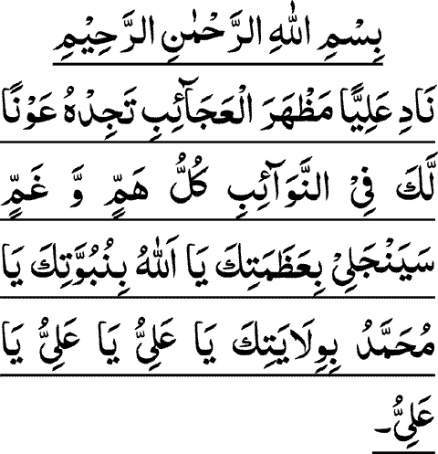 KULLO HAMMIWN WA GHAMMIN SAYANJALEE BE-A'ZAMATEKA YAA ALLAAHO BE NOBUWWATEKA YAA MOHAMMADO BE WELAAYATEKA YAA A'LIYYO YAA A'LIYYO YAA A'LIYYO.