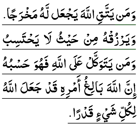 (Et quiconque craint Allàh, Il Lui donnera une issue favorable, et lui accordera Ses dons par [des moyens] sur lesquels il ne comptait pas. Et quiconque place sa confiance en Allàh, Il [Allàh] lui suffit. Allàh atteint ce qu'Il Se propose, et Allàh a assigné une mesure à chaque chose.)