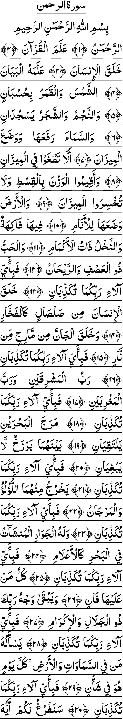 aucun de Tes Signes, ô Seigneur!), chaque fois qu'il lit le verset répétitif "FA-BIAYYI ALA'I RABBIKUMA TUKATH-THIBAN" (Lequel des bienfaits de votre Seigneur nierez-vous?). Il est dit que la récitation de cette Sourate appelle beaucoup de