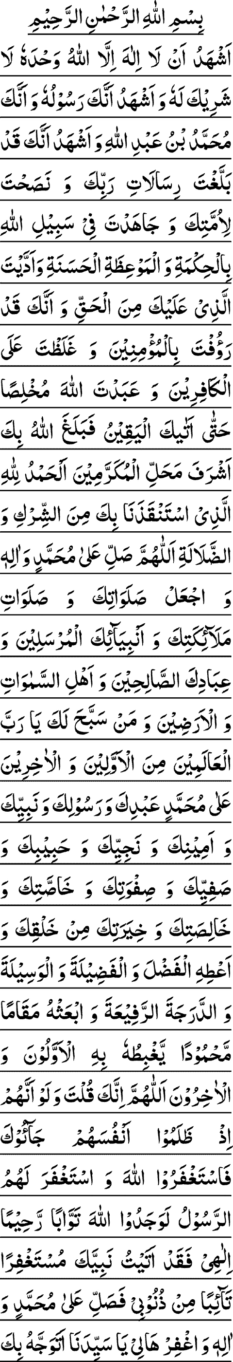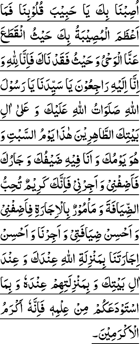 OSIBNAA BEKA YAA HABEEBA QOLOOBENAA FAMAA AA'ZAMAL MOSEEBATA BEKA HAYSUN QATA-A' A'NNAL WAHYO WA HAYSO FAQADNAAKA FA INNAA LILLAAHE WA INNAA ILAYHE RAAJEO'ON YAA SAYYEDANAA YAA RASOOLALLAAHE SALAWAATUL LAAHE A'LAYKA WA A'LAA AALE BAYTEKAT TAAHEREENA HAAZAA YAWMUS SABTE WA HOWA YAWMOKA WA ANAA FEEHE ZAYFOKA WA JAAROKA FA AZIFNEE WA AJIRNEE FA INNAKA KAREEMUN TOHIBBUZ ZEYAAFATA WA MAAMOORUN BIL EJAARATA FA AZIFNEE WA AHSIN ZEYAAFATEE WA AJIRNAA WA AHSIN EJAARATANAA BE MANZELATIL LAAHE I'NDAKA WA I'NDA AALE BAYTEKA WA BE MANZELATEHIM I'NDAHU WA BEMAS TAWDA-A'KUM MIN I'LMEHI FA INNAHU AKRAMUL AKRAMEEN