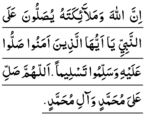 INNA ALLAH WA MALA-IKATAHOU YOUSALLOUNA ‘ALAN NABI YA AYYOUHAL LAZINA AMANOU SALLOU ‘ALAYHI WA SALLIMOU TASLIMA. ALLAHOUMMA SALLI ‘ALA MOHAMMAD WA ALI MOHAMMAD.