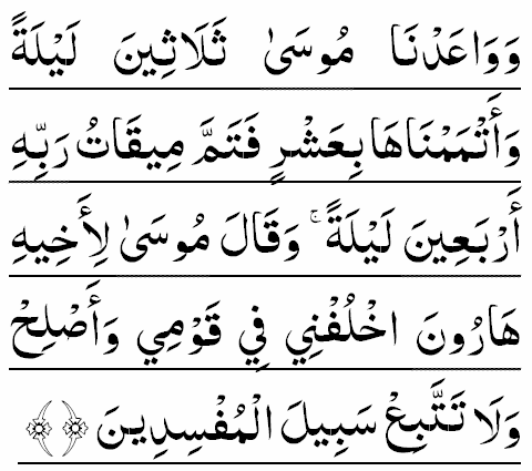 Dans chaque rak'at, réciter la Sourate Al-Fâtihah, puis la Sourate Al-Ikhlâç et le verset suivant (Qur'an 7:142) :